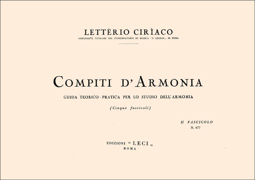 Secondo dei quattro fascicoli di Compiti d’Armonia, indispensabili per il completamento degli studi di Teoria Musicale. Essi fanno parte della celebre collana di libri didattici del Maestro Letterio Ciriaco nelle versioni originali. Questi libri hanno costantemente guidato i musicisti più talentuosi sia nel compimento degli studi, sia nell’indispensabile perfezionamento ed approfondimento in ogni cimento in cui, durante la propria carriera artistica, essi sono stati chiamati. Nello scrivere questi “Compiti d’Armonia” l’Autore non volle presentare un trattato né pretese di scrivere alcunché di nuovo. Il titolo stesso dimostra che questa pubblicazione non è altro che una Guida Teorico Pratica per allievi e maestri per lo studio e l’insegnamento dell’armonia. Su ogni capitolo dei volumi di Teoria Musicale l’Autore fa corrispondere, con ordine progressivo, uno o più esercizi grafici ed aggiunge, per ogni accordo già studiato, qualche basso per gli esercizi pratici, periodi di analisi a 4 parti vocali in posizione lata, stretta per pianoforte e modulazioni. L’Autore ritiene, infatti, che il miglior sistema per l’insegnamento dell’armonia sia basato sul riconoscimento degli accordi attraverso la nota fondamentale, eliminando così il calcolo dei numeri sopra la nota del basso dato. I compiti raccolti nei vari fascicoli della collana sono utilissimi per gli strumentisti (cultura generale) e fondamentali per coloro che intendono proseguire gli studi di composizione.